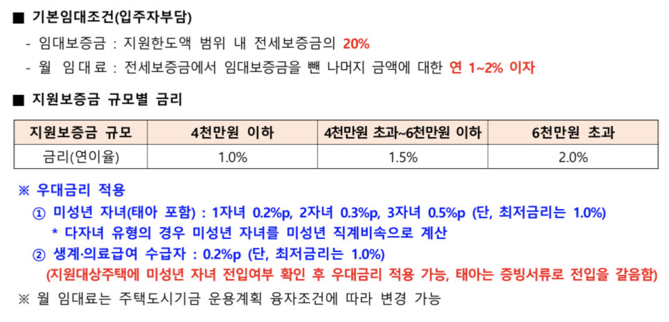 • 임대 조건: Ⅰ형(보증금 5%, 이자 1%), Ⅱ형(보증금 20%, 이자 2%).